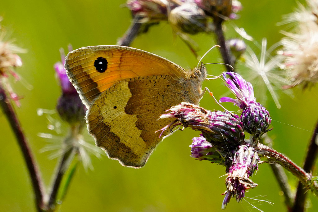 Onze deskundige gids Jacques Gerard, die met fiets uit Enschede gekomen is, zit ons al op te wachten op het nieuwe bankje aan de Broekweg. Kort na begin van onze wandeling zien we een bruin zandoogje en bij de overgang van asfalt naar zandweg de kleine ijsvogelvlinder. Jacques vertelt dat bij z’n voorverkenning zopas een grote weerschijnvlinder op z’n broek lande, hetgeen Ans de uitspraak ontlokte: “Die kent z’n vrienden”. Even verderop op een strook bramen in de bosrand zien een groot dikkopje, citroenvlinder, hooibeestje, geaderd witje en distilvlinder.