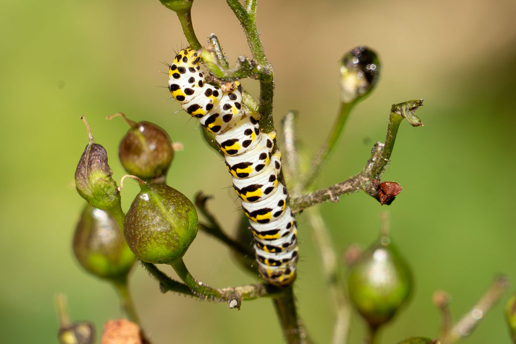 Op de zandweg zit een landkaartje. Op een onlangs gemaaid veldje zien we een groot aantal sint-jansvlinders die hun plekje gevonden hebben op de verspreid staande distels. Even verderop een gehakkelde aurelia en koevinkje en tegen de bosrand kleine ijsvogelvlinders op bloeiende braam, hun nectar en voedselplant. Dichtbij staat kamperfoelie, waar de rups van deze vlinder voedsel vindt.